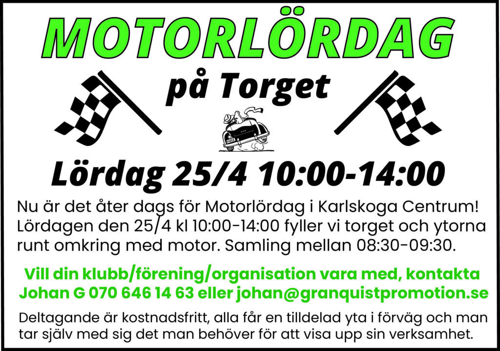 På lördag är det dags för Motorlördag på Torget och Karlskoga Motorweteraner är som vanligt på plats. Vill du vara med med ditt fordon så är det samling mellan 08:30-09:30. Vi har gott om plats. Infart från Katrinedalsgatan